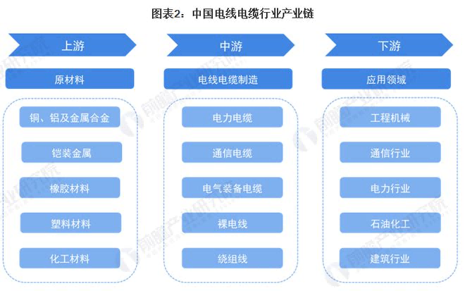 目前,我國電線(xiàn)電纜行業(yè)產(chǎn)業(yè)鏈較為成熟,上游行業(yè)主要為提供制造電線(xiàn)電纜產(chǎn)品原材料的基礎材料行業(yè)以及制造交聯(lián)絕緣套及護套料的橡膠行業(yè),如銅、鋁及其合金、聚乙烯、聚氯乙烯化工行業(yè)等;中游包括提供電力電纜、通信電纜、電氣裝備用電纜及裸電線(xiàn)、繞組線(xiàn)等其他類(lèi)型電纜的電線(xiàn)電纜生產(chǎn)制造企業(yè);下游主要為對電線(xiàn)電纜有需求的行業(yè),如工程機械、通信行業(yè)、電力行業(yè)、石油化工及建筑行業(yè)等。
